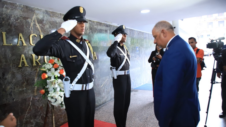 Las bancadas parlamentarias, encabezada por el jefe de esta entidad, Jorge Herrera, salieron al exterior del Hemiciclo donde colocaron la ofrenda floral en el busto de la reconocida figura.
