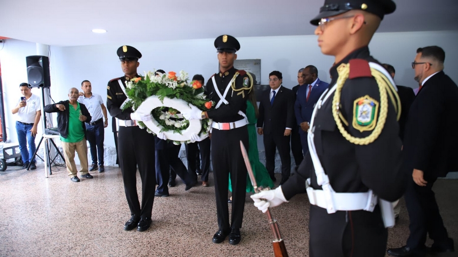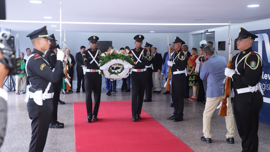 Las bancadas parlamentarias, encabezada por el jefe de esta entidad, Jorge Herrera, salieron al exterior del Hemiciclo donde colocaron la ofrenda floral en el busto de la reconocida figura.