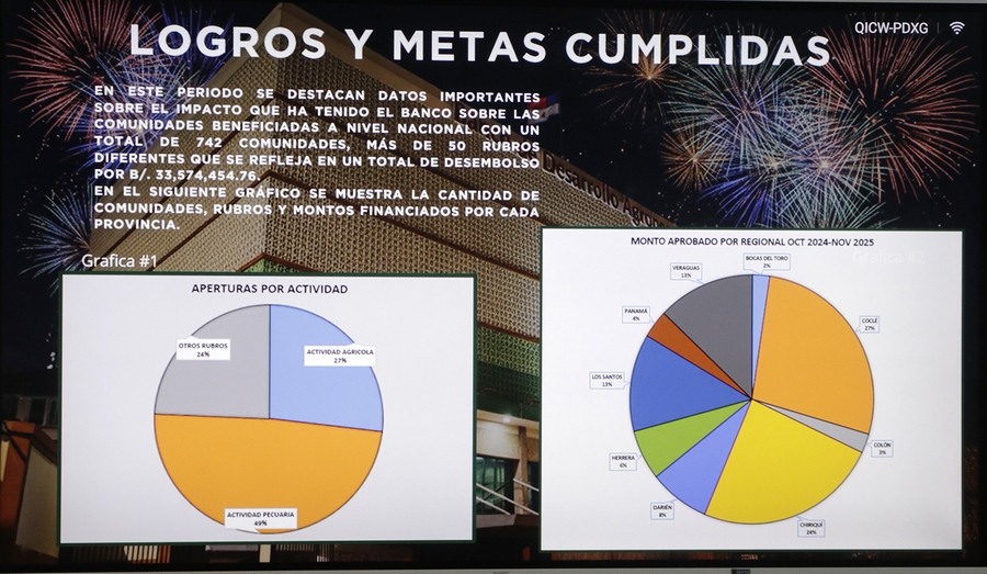 “Los créditos del BDA han beneficiado a cientos de productores de 742 comunidades, especialmente de áreas rurales con un desembolso de 33,5 millones de balboas en más de 50 rubros del sector agropecuario, como lo muestran los gráficos”, indicó Mejía.